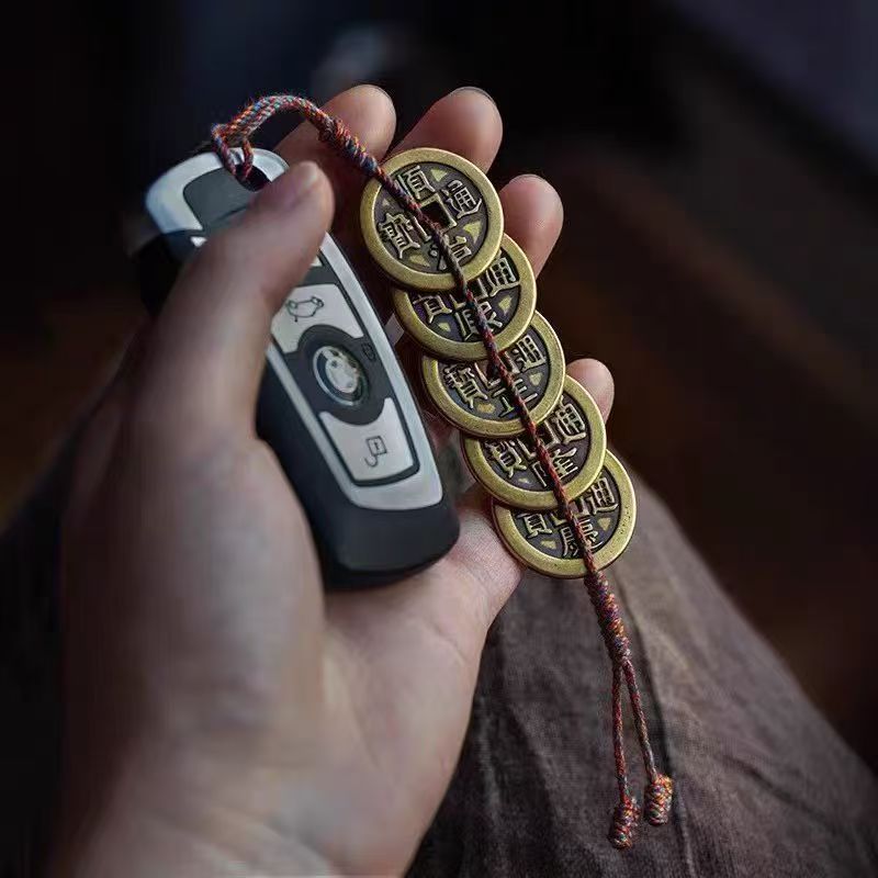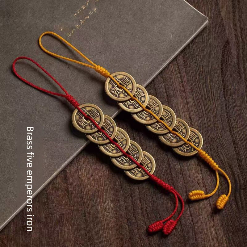 Pure copper Five Emperors coin door pendant with red and yellow rope, copper coin home decoration, Six Emperors coin keychain pendant